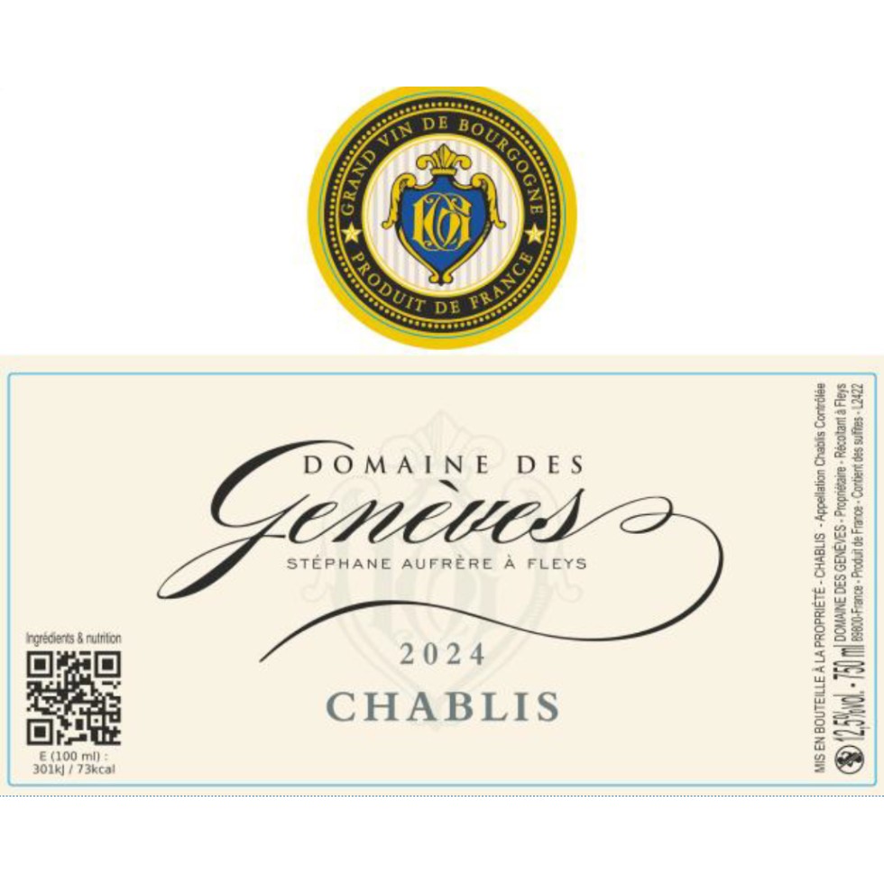 Chardonnay: la principal uva blanca de los vinos de Borgoña, que produce los vinos blancos de Chablis. La añada del Domaine des Genéves revela una nariz profunda con los aromas de tostado y piedra húmeda y un impresionante núcleo de cítricos, minerales y pedernal.