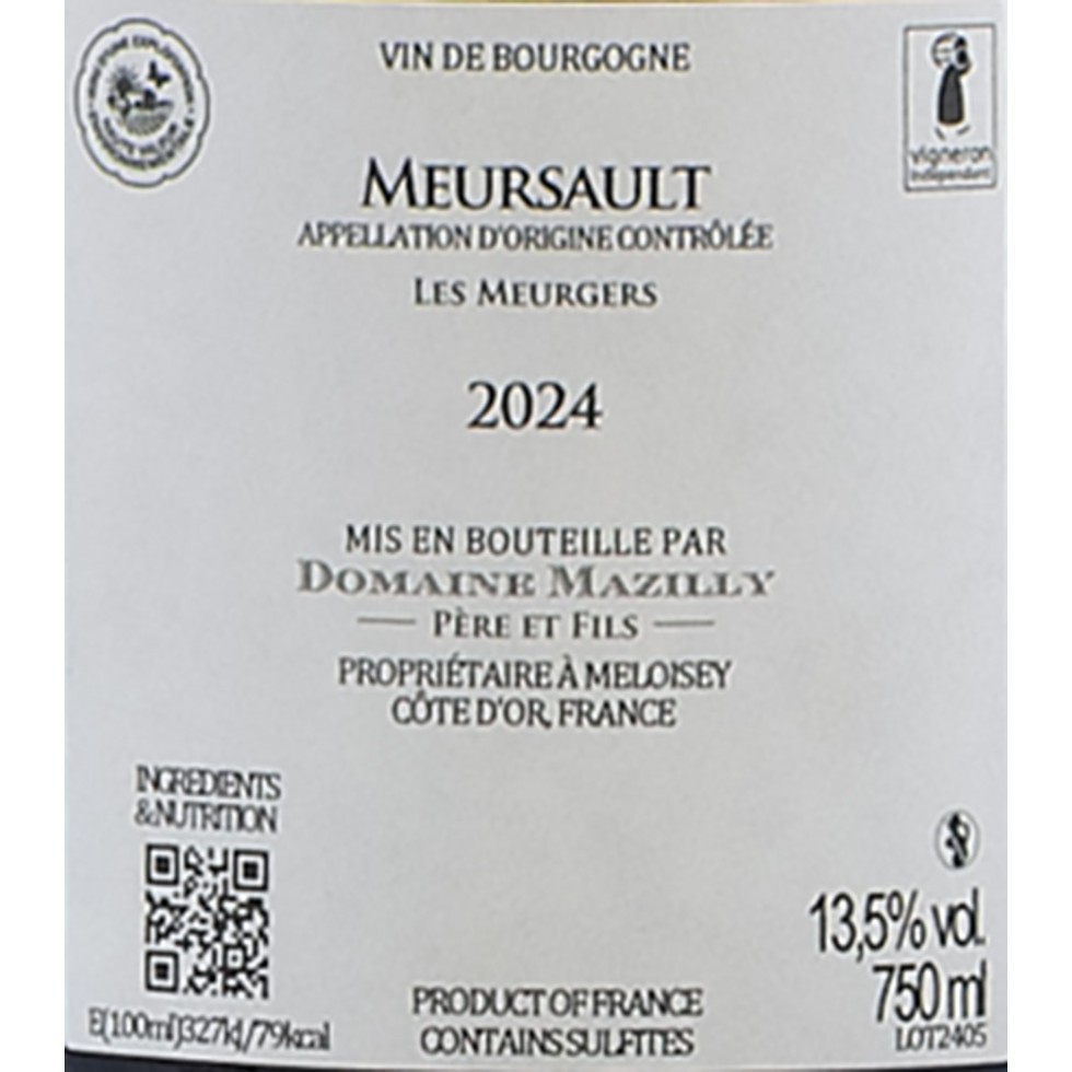 Meursault blanc 2024 "Les Meurgers" du domaine Mazilly, très équilibré, gras complexe et intense.